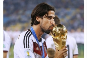 德国队官方社媒晒出赫迪拉亲吻大力神杯的照片,配文:“38岁生日快乐,赫迪拉!2014年世界杯冠军!”