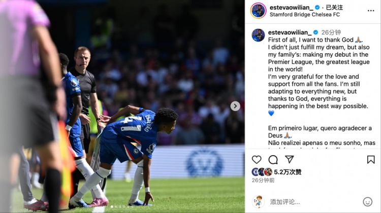 8月19日英超首轮战报,切尔西在斯坦福桥球场与水晶宫0-0握手言和。比赛第54分钟,蓝军新援埃斯特旺迎来职业生涯重要时刻,完成切尔西一线队正式比赛首秀。赛后这位巴西小将在社交媒体发文感恩,并分享英超首秀纪念照片。他在推文中深情写道:首先要将荣耀归于上帝 🙏🏽。今天不仅圆了我的梦,更实现了全家人的夙愿——在世界第一联赛英超完成首秀!衷心感谢所有蓝军球迷的热情支...